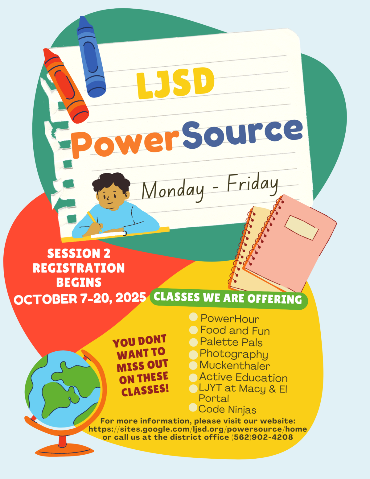 [Tuesday, Sep 30 at 5:28 PM] Due to NEW California state funding, ALL LJSD TK- 6th grade students are eligible to attend PowerSource on scholarship*!